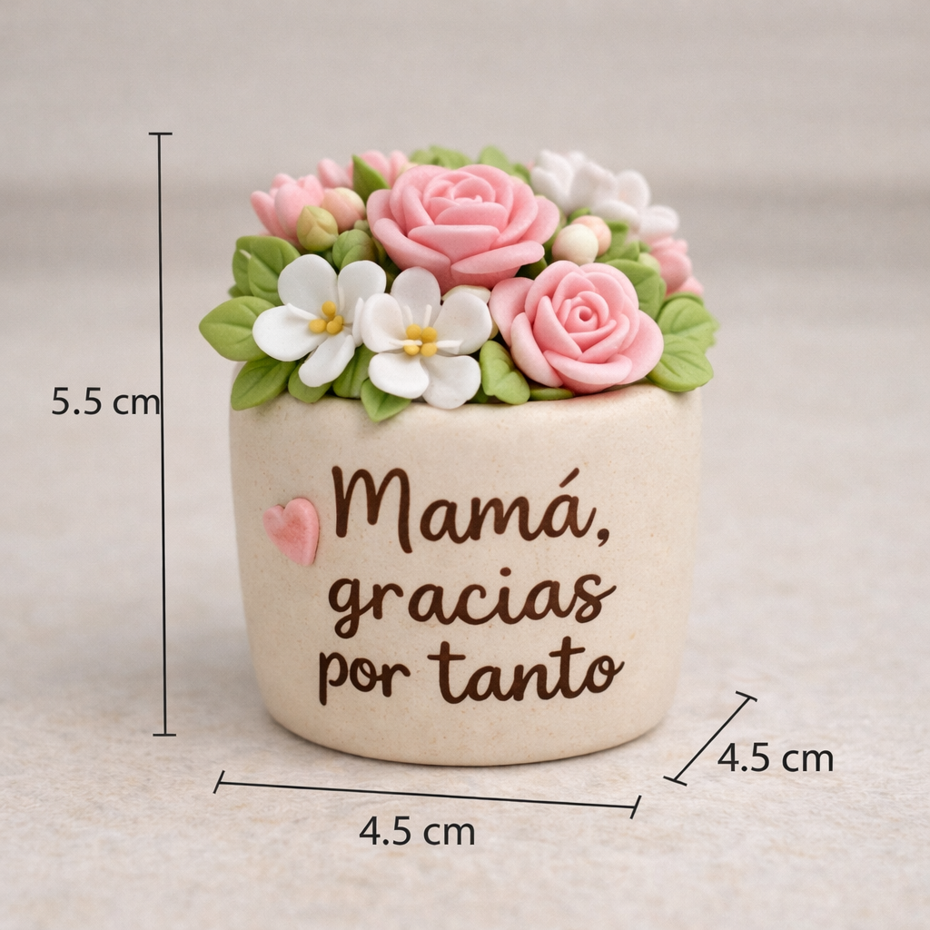 Mini macetas decorativas • Con frases como: “Mamá, gracias por tanto” • Con flores artificiales o suculentas En porcelana fría, 3D o resina de buena calidad y con exelente gusto, para regalos, decoraciones o simplemente para recordar un evento o historia.